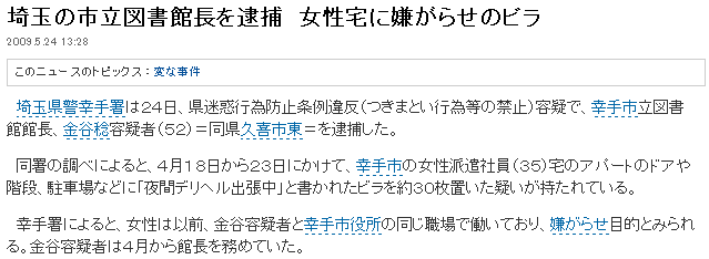埼玉の市立図書館長を逮捕 女性宅に嫌がらせのビラ 2009.5.24 13:28