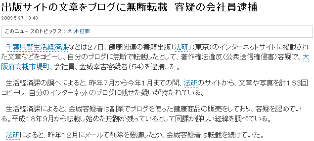 出版サイトの文章をブログに無断転載 容疑の会社員逮捕 2009.5.27 18:48