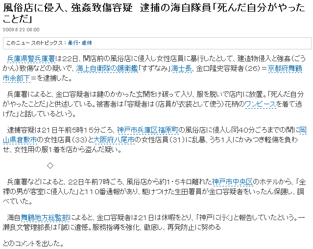 風俗店に侵入、強姦致傷容疑 逮捕の海自隊員「死んだ自分がやったことだ」 2009.6.22 08:00