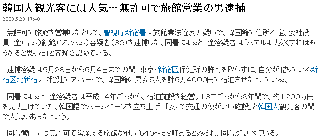 韓国人観光客には人気…無許可で旅館営業の男逮捕 2009.6.23 17:40