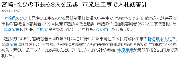 宮崎・えびの市長ら3人を起訴 市発注工事で入札妨害罪 2009.8.3 19:07