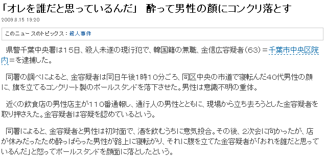 「オレを誰だと思っているんだ」 酔って男性の顔にコンクリ落とす 2009.8.15 19:20