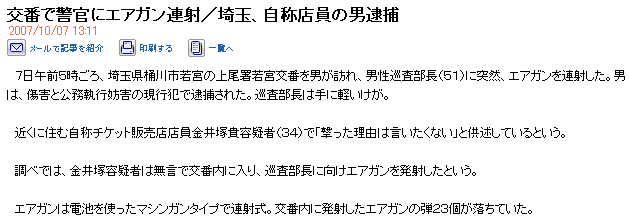 交番で警官にエアガン連射/埼玉、自称店員の男逮捕 2007/10/07 13:11
