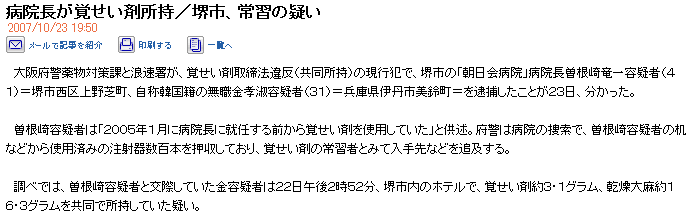 病院長が覚せい剤所持/堺市、常習の疑い 2007/10/23 19:50