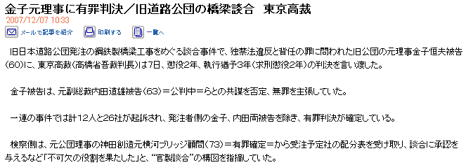 金子元理事に有罪判決/旧道路公団の橋梁談合 東京高裁 2007/12/07 10:33
