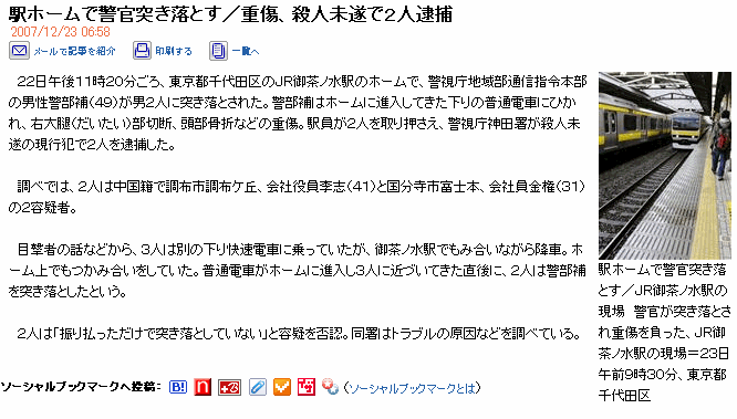 駅ホームで警官突き落とす/重傷、殺人未遂で2人逮捕 2007/12/23 06:58
