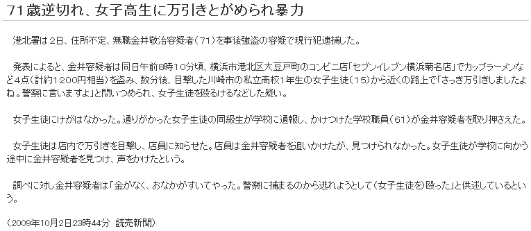 71歳逆切れ、女子高生に万引きとがめられ暴力