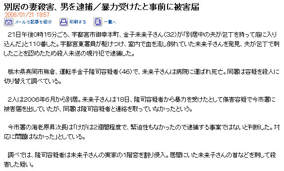 別居の妻殺害、男を逮捕/暴力受けたと事前に被害届 2008/01/21 18:57