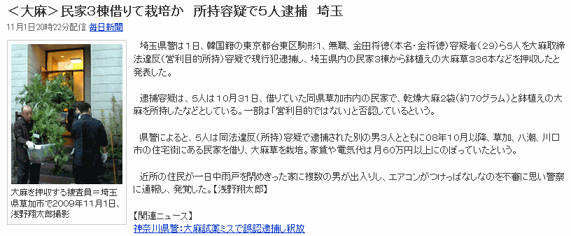 <大麻>民家3棟借りて栽培か 所持容疑で5人逮捕 埼玉 11月1日20時22分配信 毎日新聞