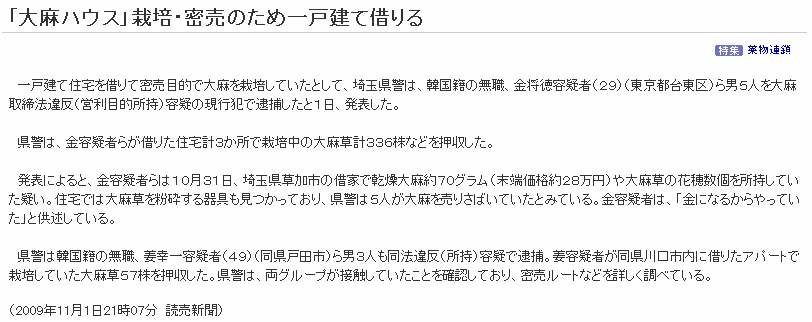 発表によると、金容疑者らは10月31日、埼玉県草加市の借家で乾燥大麻約70グラム(末端価格約28万円)や大麻草の花穂数個を所持していた疑い。住宅では大麻草を粉砕する器具も見つかっており、県警は5人が大麻を売りさばいていたとみている。金容疑者は、「金になるからやっていた」と供述している。