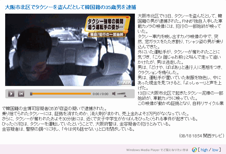 大阪市北区で13日、タクシーを盗んだとして、韓国籍の男が逮捕された。FNNが独自入手した車載カメラの映像には、犯行の一部始終が映っていた。