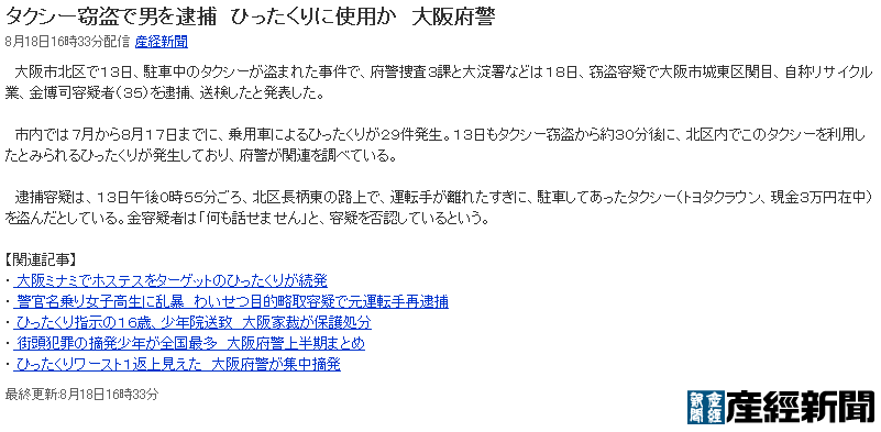 タクシー窃盗で男を逮捕 ひったくりに使用か 大阪府警 8月18日16時33分配信 産経新聞