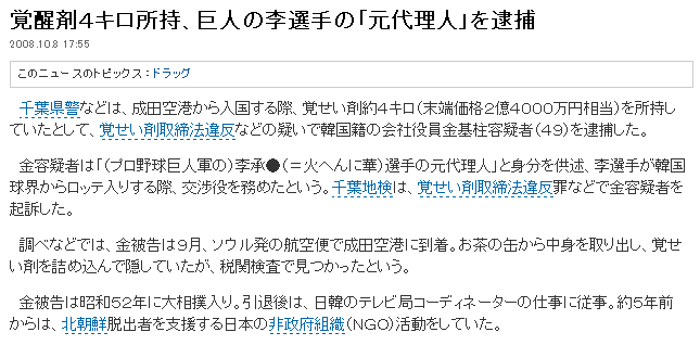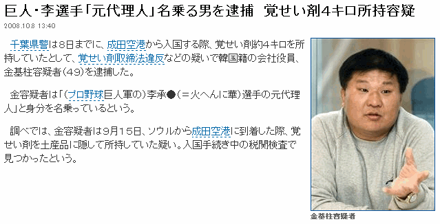 覚醒剤4キロ所持、巨人の李選手の「元代理人」を逮捕 2008.10.8 17:55