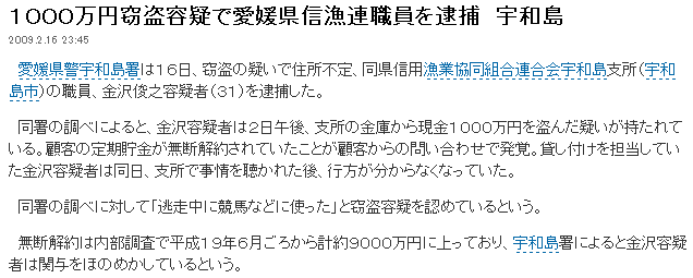 1000万円窃盗容疑で愛媛県信漁連職員を逮捕 宇和島 2009.2.16 23:45