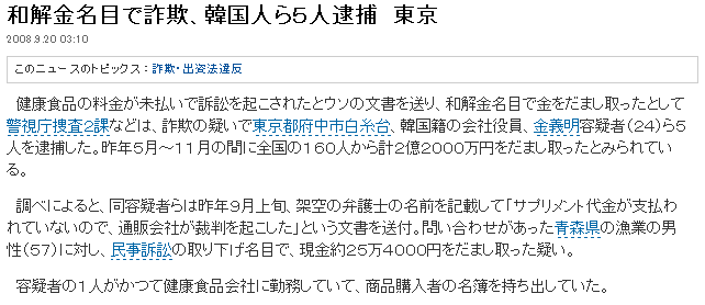和解金名目で詐欺、韓国人ら5人逮捕 東京 2008.9.20 03:10