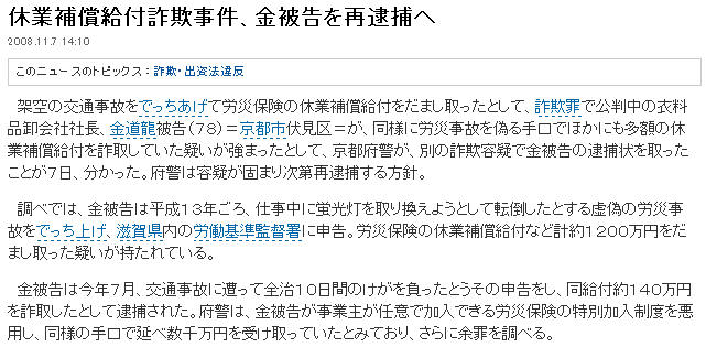 休業補償給付詐欺事件、金被告を再逮捕へ 2008.11.7 14:10