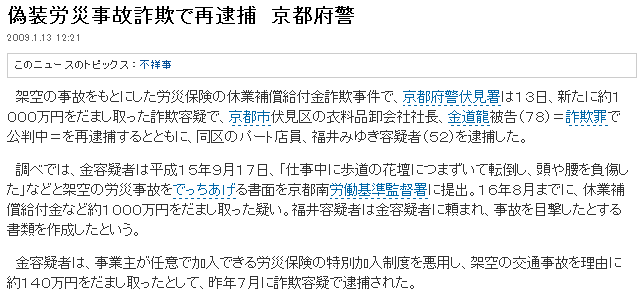 偽装労災事故詐欺で再逮捕 京都府警 2009.1.13 12:21