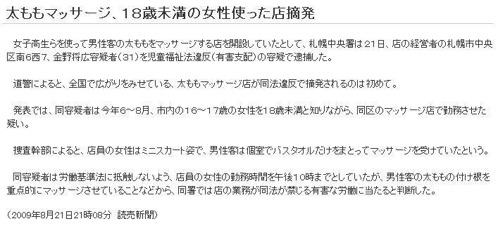 太ももマッサージ、18歳未満の女性使った店摘発 (2009年8月21日21時08分 読売新聞)